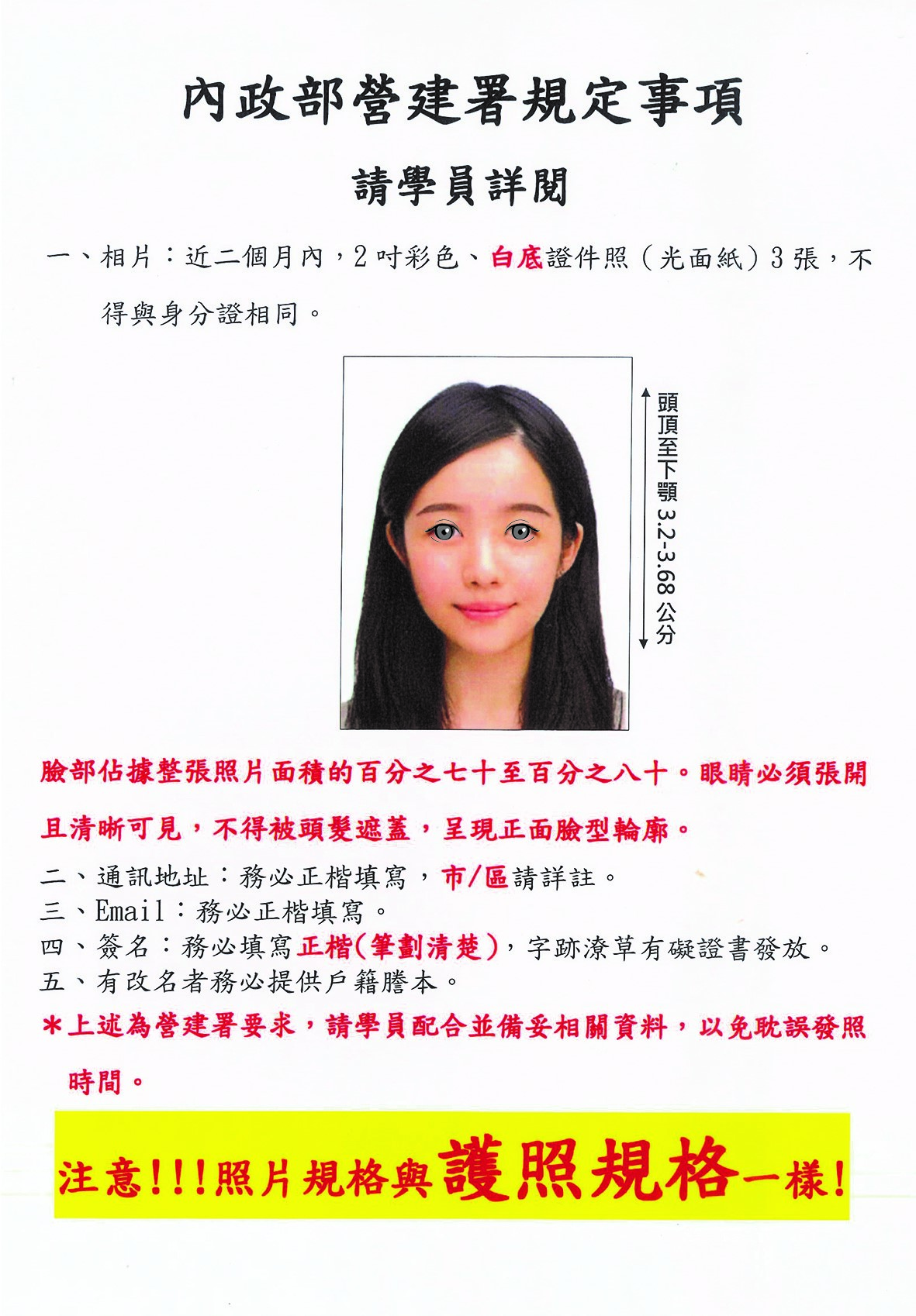 3.近2個月內2吋的白底彩色大頭照3張(符合護照格式)(不可與身份證照片相同、不可為學士照或自拍照)